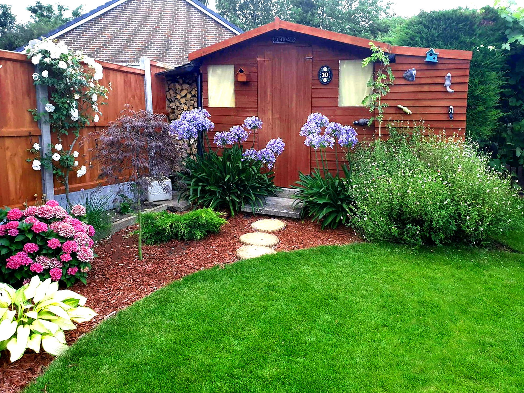 Learn MoreFamily modern garden with tarrace, summer house and mixed border plants.
