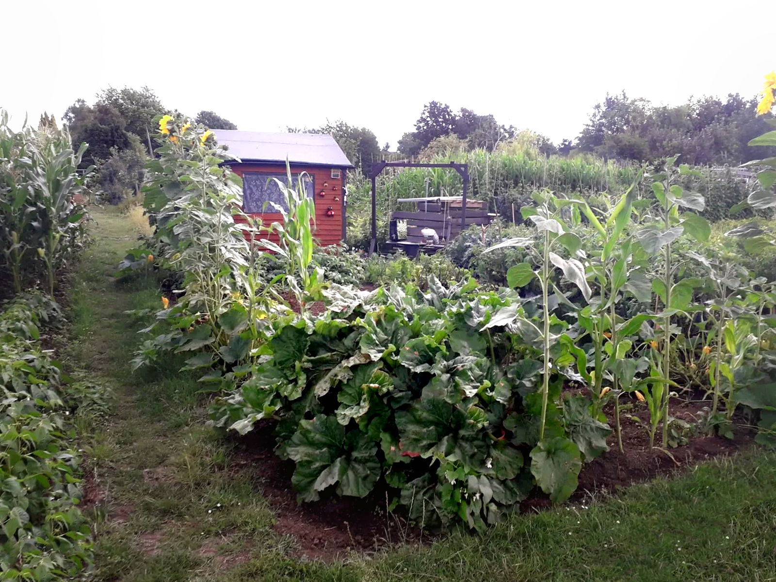 Small garden at allotment with functional layout and surface. It is divided into small herb and vegetable beds.